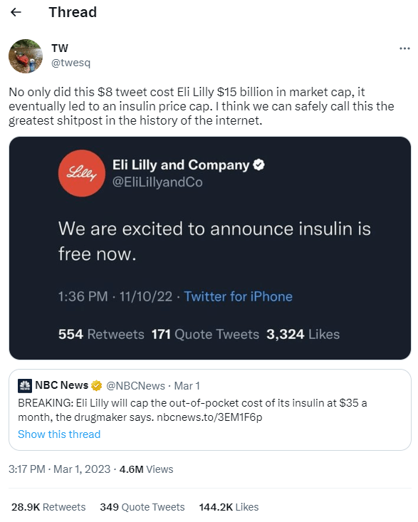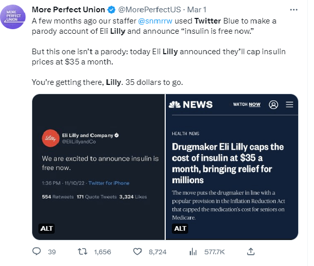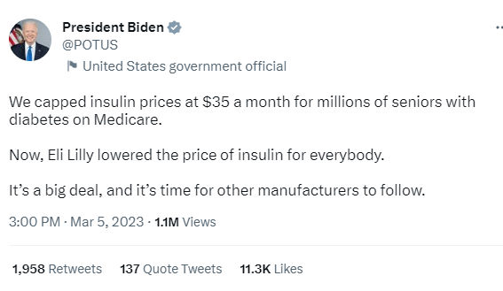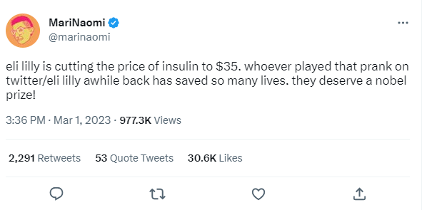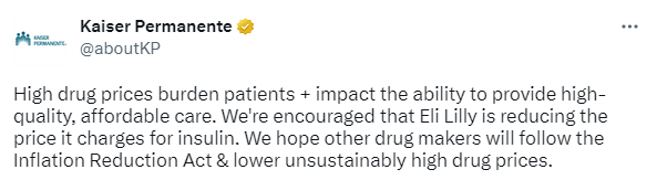 In 2022, it was reported that some uninsured patients in the US were paying over $1000 per month for insulin. The cost of medicines – particularly insulin – in the US has been under fire for some time. The Inflation Reduction Act was passed last year to give Medicare power to negotiate on the price of certain drugs and a monthly price cap of $35 for insulin for Medicare patients was also introduced. Efforts to introduce the insulin price cap in the private healthcare market were blocked by Republicans, but Eli Lilly appears to have read the room. It’s worth noting that in November 2022, the company was also at the center of a media storm and public shaming campaign – triggered by the great Twitter blue tick debacle when a parody “verified” Lilly Twitter account posted that insulin would be available for free. Lilly seems not to have posted on Twitter since.