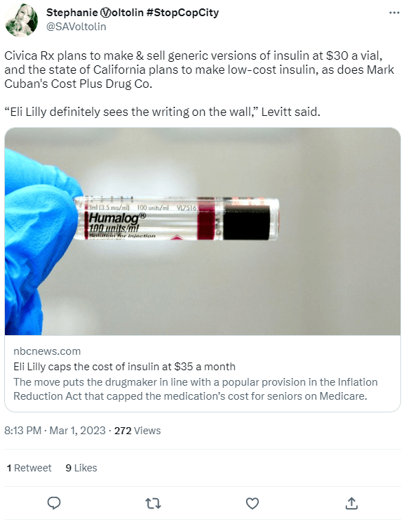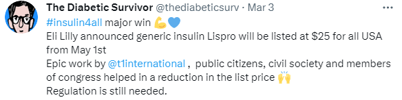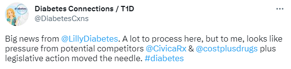 In fact, some Twitter users believe that the latest announcement stems from the backlash Lilly experienced last year. What else are Twitter users saying about Lilly’s latest announcement? There’s a lot of celebration, but some have pointed out that Lilly had to do something with incoming competition from organizations like Civica Rx, which has been shaking up the generic drug market with its nonprofit model. The company announced plans in early 2022 to manufacture and launch insulin at no more than $30 per vial.