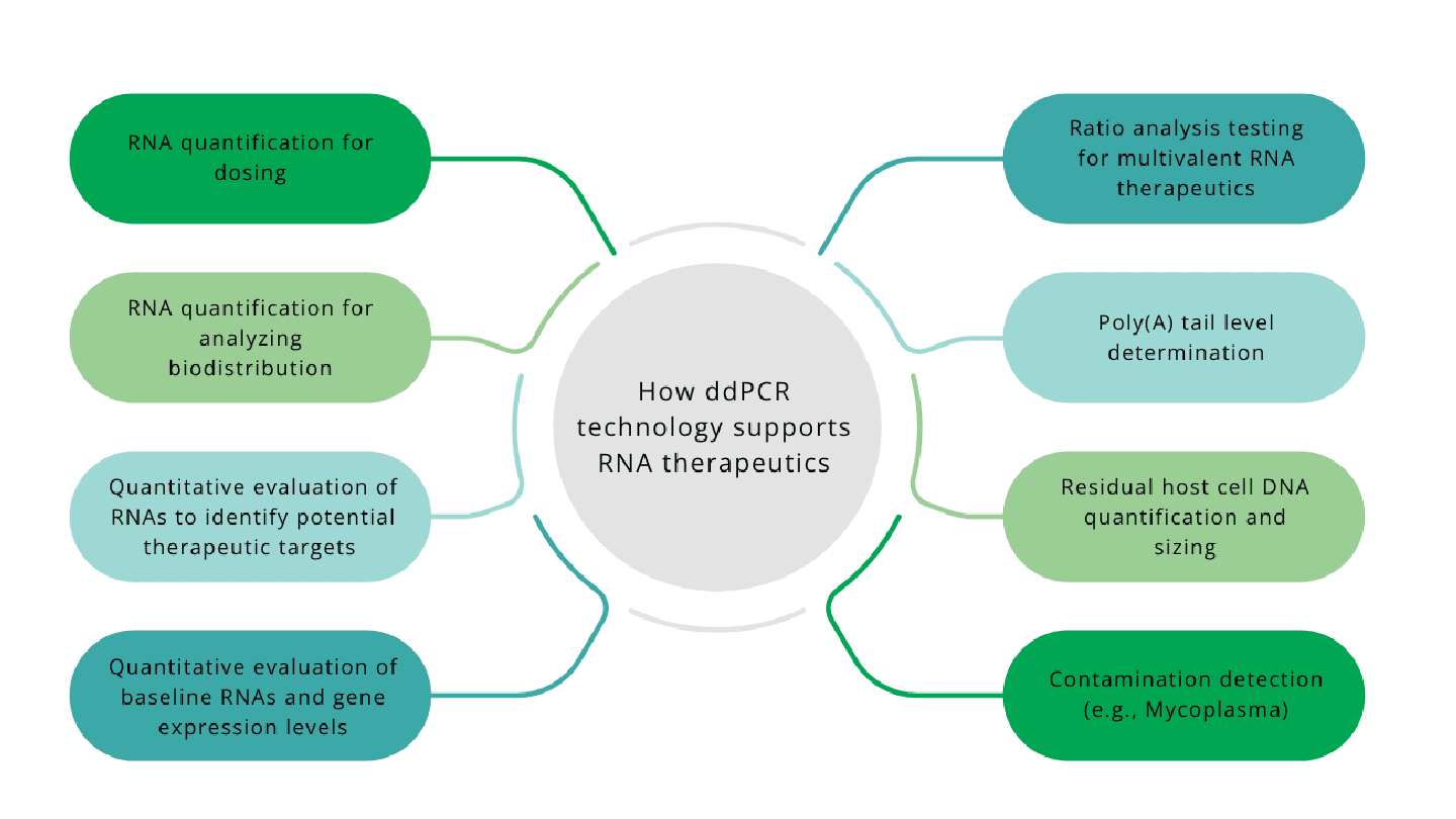 In conclusion, RNA therapeutics represent a promising and rapidly advancing field with transformative potential in treating a wide range of diseases. However, the path to their production at the commercial scale is complex and requires the availability of reliable analytical tools. ddPCR technology has emerged as a key analytical technology that offers numerous advantages in overcoming the challenges associated with the development and quality control of RNA-based therapies due to its high sensitivity, specificity, and capacity for absolute quantification of target molecules. The successful clinical applications of ddPCR solutions, particularly in the accelerated production timelines of COVID-19 mRNA vaccines, emphasize its critical contribution to ensuring the efficacy and safety of these novel treatments.